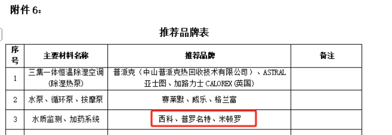 8.合同中水泵、循环泵、按摩泵的推荐品牌为:赛莱默、威乐、格兰富。
